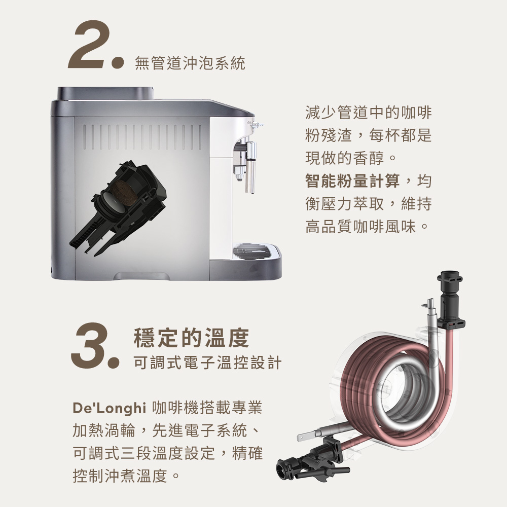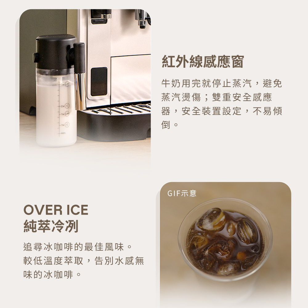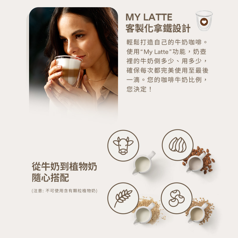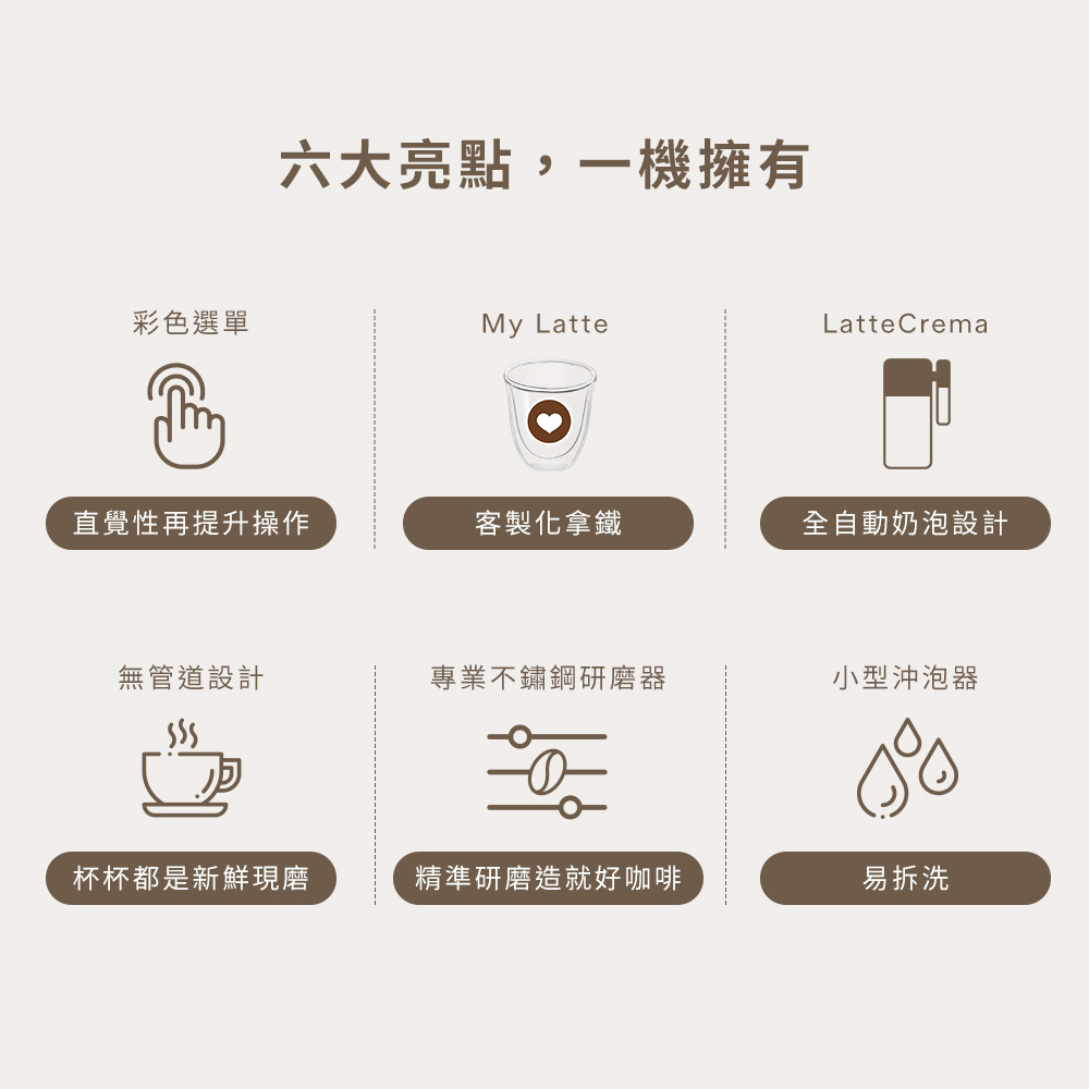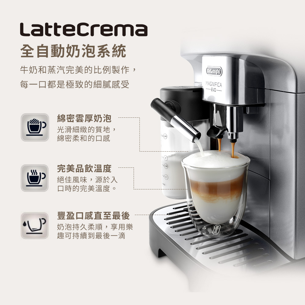 - LatteCrema 奶泡系統:細緻綿密奶泡,溫度穩定
